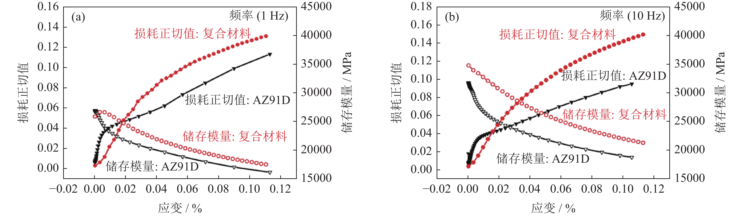 2AlC/Mg matrix composites with the dense three-dimensional network structure were prepared by auxiliary pressure infiltration process. The microstructure and phase composition of the composites were investigated by scanning electron microscope (SEM) and X-ray diffractometer (XRD), and the damping performance of the composites was tested by vibration analyzer. The results show that, the composites have the two-scale three-dimensional network structure at the macro and micro levels. At the constant temperature, the maximum loss tangent values of the composites are 0.13 and 0.15 at 1 Hz and 10 Hz, respectively, increasing by about 30% and 67% compared with AZ91D, the damping performance is enhanced. Under the constant strain, the composites have the maximum loss tangent value at the highest test temperature. In the two test conditions, both of the storage modulus is higher than that of AZ91D. From the view of the balance between internal friction and storage modulus, the composites not only have the wider application temperature range, but also have the better damping-strength balance.